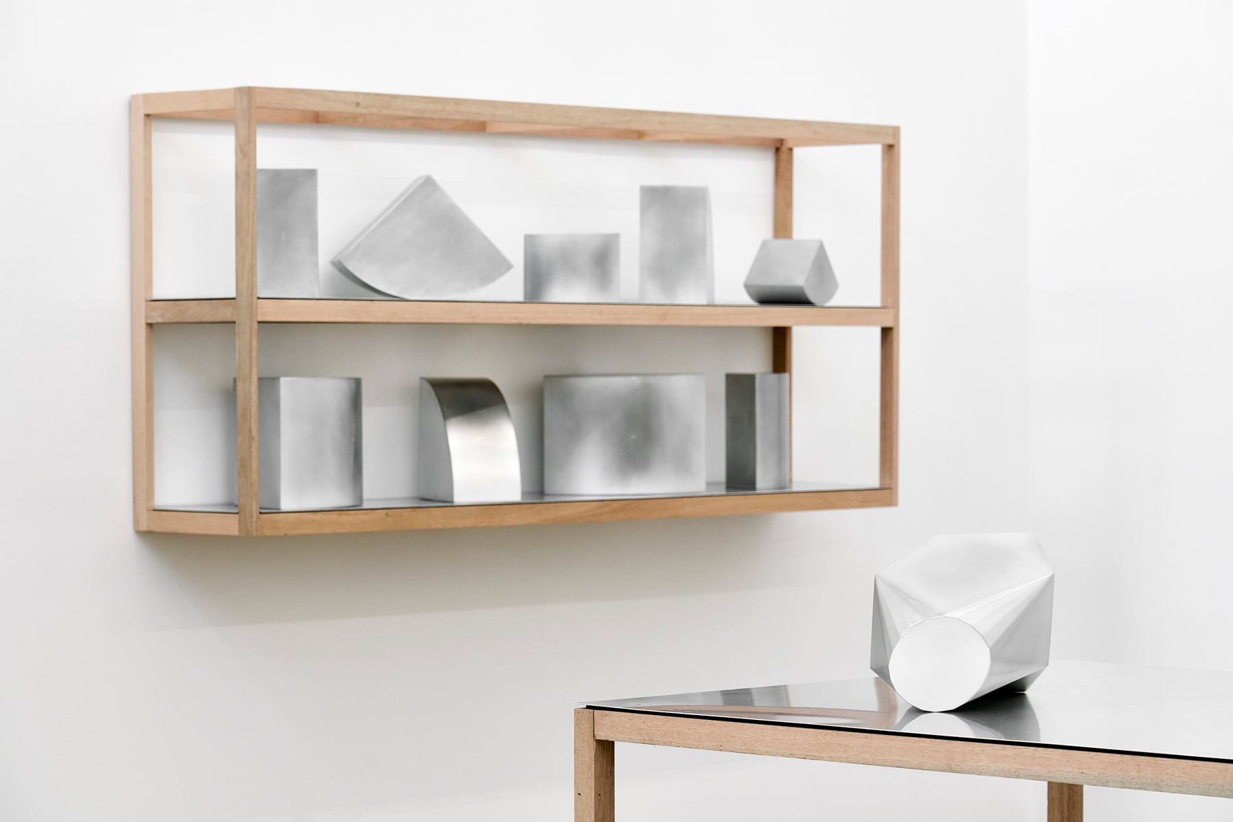 This exhibition has 11 starting points: 11 sculptures, variously formed in stainless steel, aluminium, and plaster. They act as 11 coordinates or cues. They are prompts, a network of parallels and perpendiculars that render sequence non-linear but in chorus and company. In this way, Kyle Morland’s latest exhibition, Notes on a grid, is a gathering.